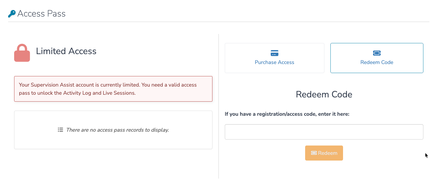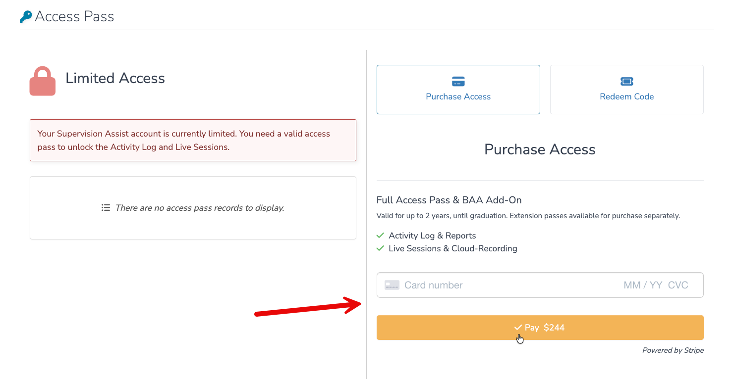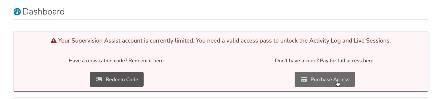 Students can register their Supervision Assist accounts without making up-front payments. Upon registration, their accounts are "limited" and blocked from using key features in Supervision Assist. In order to unlock and use these key features, students need to acquire an Access Pass.